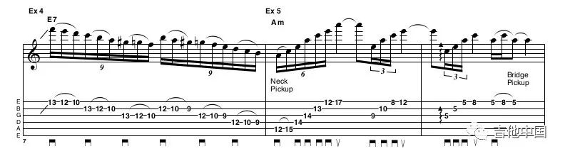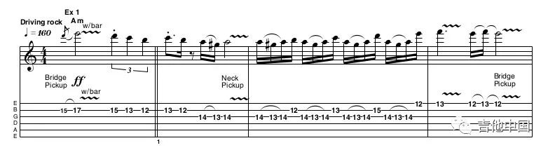 如图所示,谱子前两小节非常简单,但务必确保推弦的精准性。为了更接近Yngwie的演奏,确保在最后一个音结束后,将琴桥拾音器切换为琴颈拾音器。