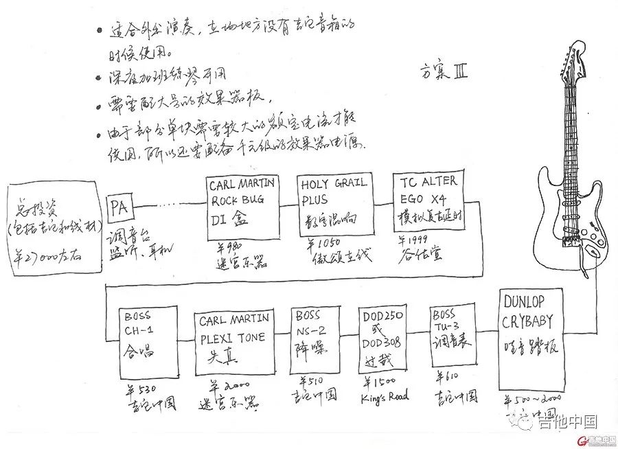 方案三:适合很多演出场合。和方案2的区别就在于,用的单块都已经像模像样了,而且后面加了个DI盒子,可以直接进调音台。毕竟不是所有的场子都有大马勺给你玩的。