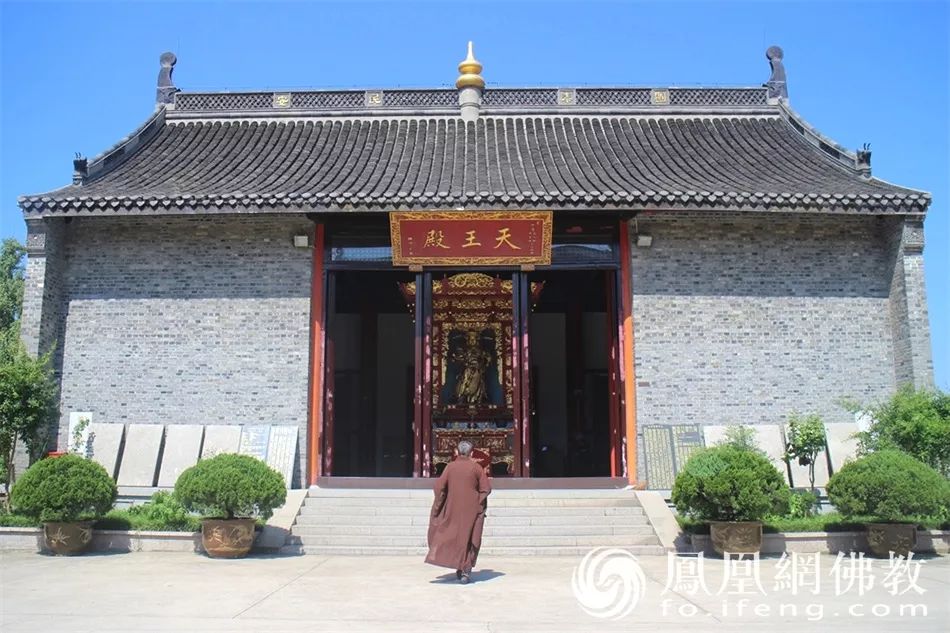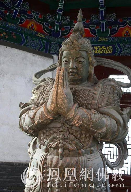 在我国佛教寺院中,韦驮菩萨像常威武地立于最靠近寺院门口的四天王殿内,面向着寺院,以守护伽蓝道场。图为扬州文峰寺巍峨高大的明式天王殿庄严肃穆。身披甲胄,摧邪辅正的韦驮菩萨塑像就竖立在这里,依枕着千年运河之波,守护着文峰古塔下的这一方净土。(图片来源:凤凰网佛教 摄影:邵卓)