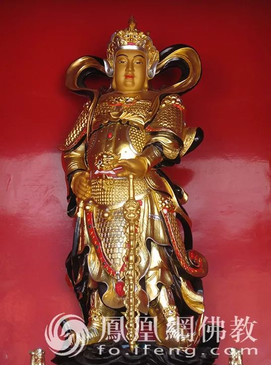 韦驮菩萨的金刚杵,象征着所向无敌、无坚不摧的智慧和真如佛性,它可以断除各种烦恼、摧毁形形色色障碍修道的恶魔。图为广东东莞芙蓉寺韦驮菩萨。(图片来源:凤凰网佛教 摄影:白君凯)