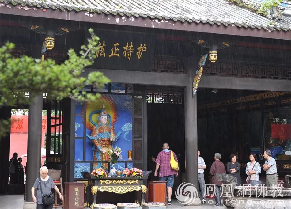 从宋代开始,韦驮菩萨常站在弥勒佛像背后,面向大雄宝殿,不仅护持着道场、护助着出家人,而且在现天大将军身时,担当佛教中驱除邪魔,保护佛法的重任。图为成都温江大乘院,在韦驮殿躲雨的游客和挎包出寺的护法居士,组成了这幅完美的画面。(图片来源:凤凰网佛教 摄影:于椿根)