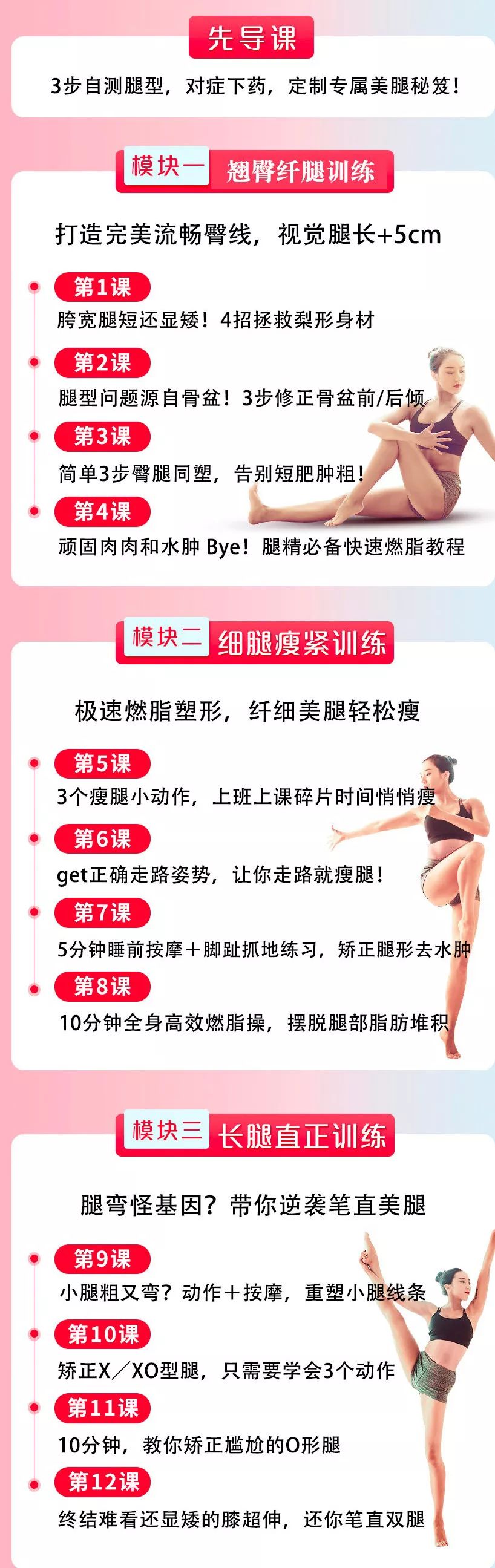 课程将按照腿型、成因、身型三个维度,细分出3*3个模块,针对性的解决各种腿型问题。