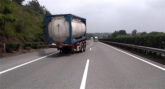 到达现场后,民警看到一辆上海牌照的危险品槽罐车车身头南尾北停于慢车道上,车身占用了整个车道,车头停在应急道上,路上不停有车辆穿过,情况十分危险,民警第一时间叫来了司机,询问了下情况,同时对现场划定了警戒区域并做好了预警。