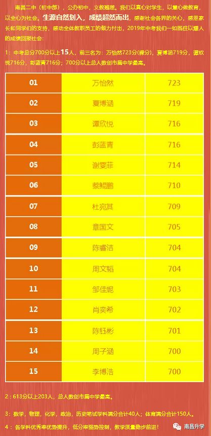 1:中考总分700分以上15人,前三名为:万怡然723分(裸分),夏博涵719分,谭欣悦716分,彭蓝青716分;700分以上总人数创市属中学最高。