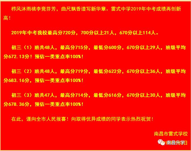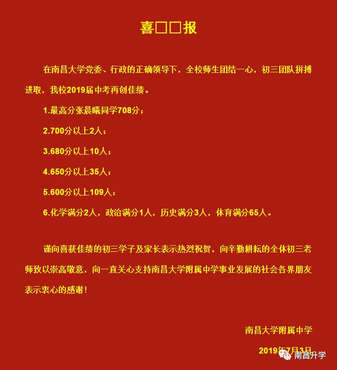 7月3日南昌中考成绩已正式公布,各大学校中考喜报也已陆续公布。2019南昌中考一批次重点线为613分,师大附中线686分。