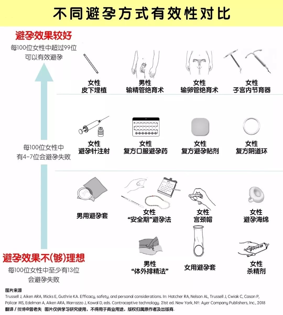 避孕是两个人的事,需要男女双方配合完成。不同避孕方式有效性对比如下: