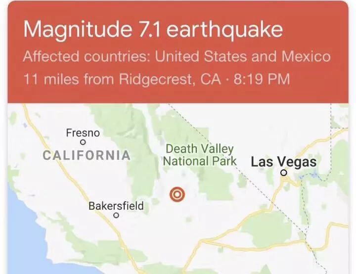 7月4日、7月5日加州连续发生两次地震,一次是6.4级,一次是7.1级,两次地震震级都不低,后者是南加州近20年来发生的最强地震,但是值得庆幸的是,这两次地震均为造成任何人员伤亡。