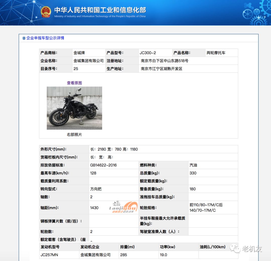 不过近几日金城集团的一款新品太子车款登上了国家工信部的目录页面,根据目录显示这款新车搭载有一台排量295cc发动机,最高时速为128km/h。