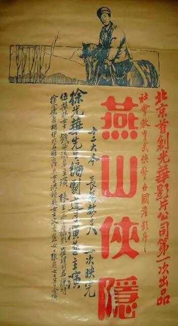 1926年上映的电影《燕山侠隐》, 是我国现存最早的电影海报 。海报画面依旧是简单的人物影像和大幅毛笔字,但字体已呈现多元化,且海报色彩不再是黑白色,转以红色大字提出片名。虽构图简单,但在早期电影海报有如此跨越已属不易。