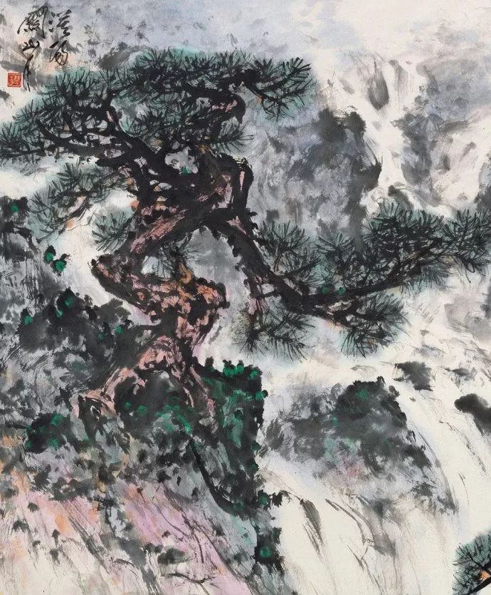 画面中大雨过后形成的多处高山山泉汇聚成瀑布飞流直下,气势磅礴。而两旁的苍松巍然屹立,历经岁月的洗礼仍然表现出顽强生命力,整个画面表现出极强的艺术感染力。
