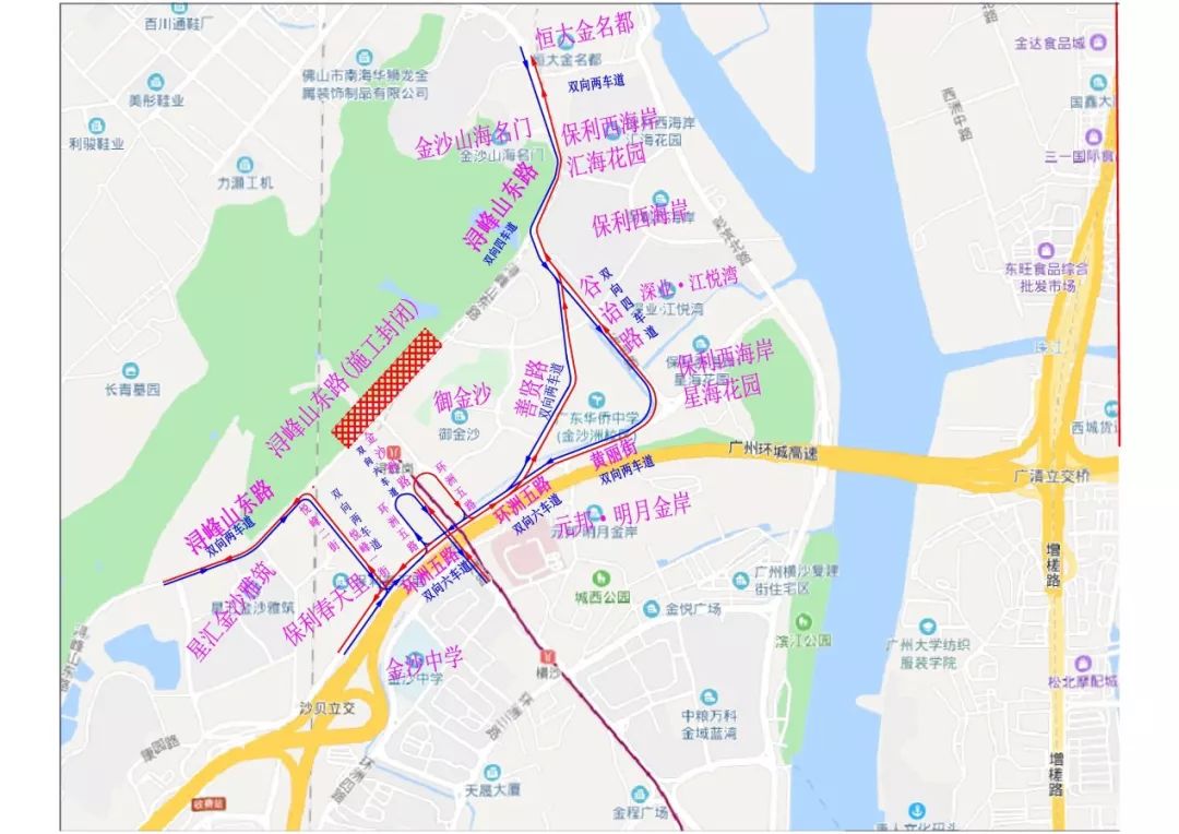 一期围蔽后周边交通疏解平面图(注:红色线为往佛山方向、蓝色线为往市区方向)