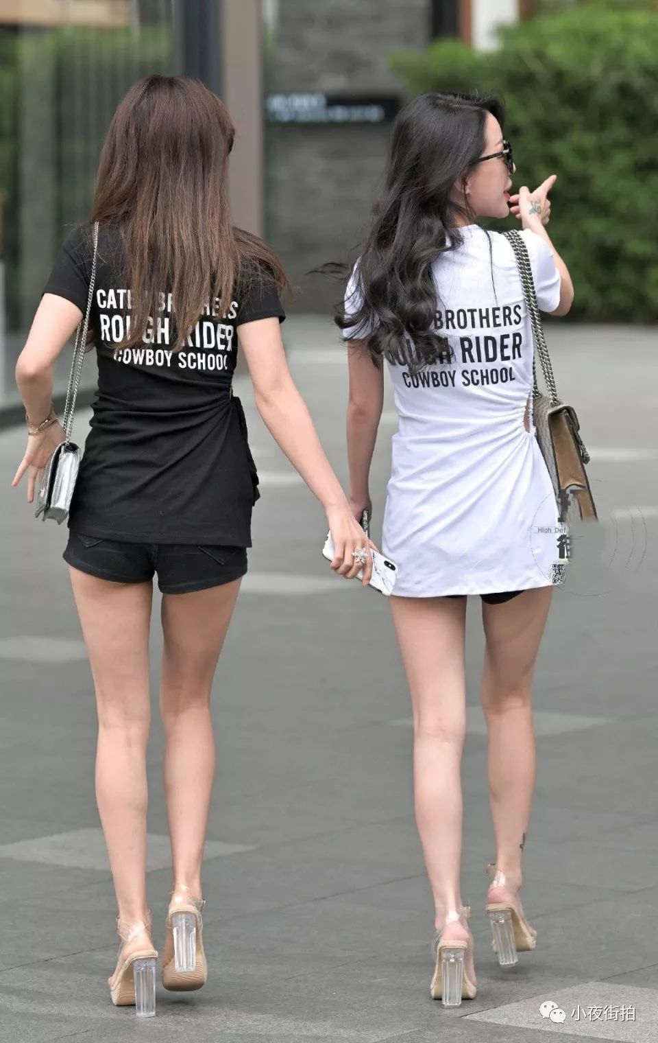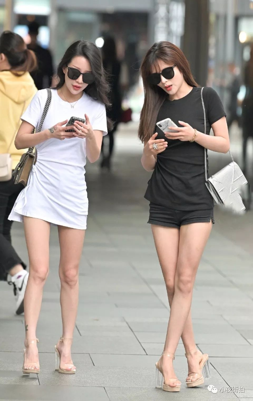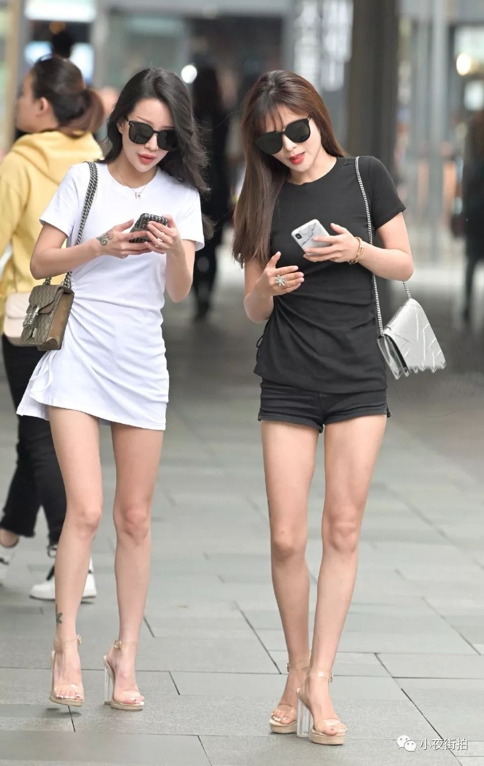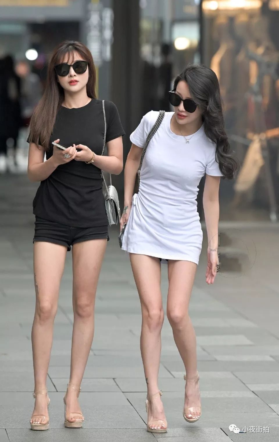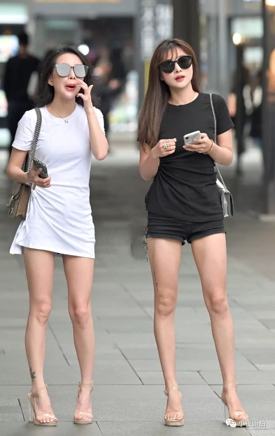 街拍:街头巧遇阴阳姐妹双姝,修长的美腿同样的穿搭,你更喜欢谁?