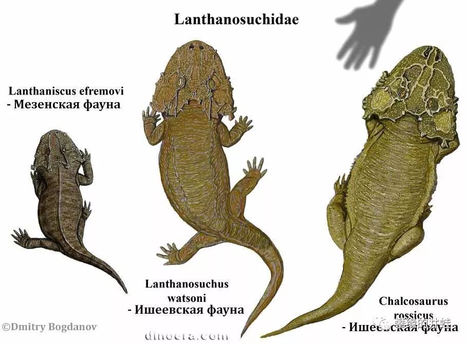三种兰炭鳄属动物复原图。化石全部发现于俄罗斯鞑靼斯坦,最大的可以长到75厘米长。关于兰炭鳄的资料很少,许多问题都悬而未决。比如它们头骨上别致的纹路是干什么的;比如它们的生活习性是怎样的。这个大扁脑袋无论吃草还是吃肉,都不适合在陆地上进食。许多研究者认为它真的是一种水栖或者半水栖动物,捕食鱼虾,伏击岸边的小动物,也算对得起名字里的“鳄”字。如果真是这样,那兰炭鳄就获得了一项成就:最早和离片椎类抢夺河岸杀手这个生态位的羊膜类。图片来源见水印。