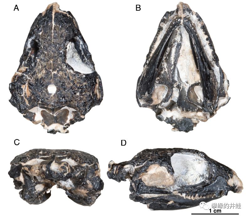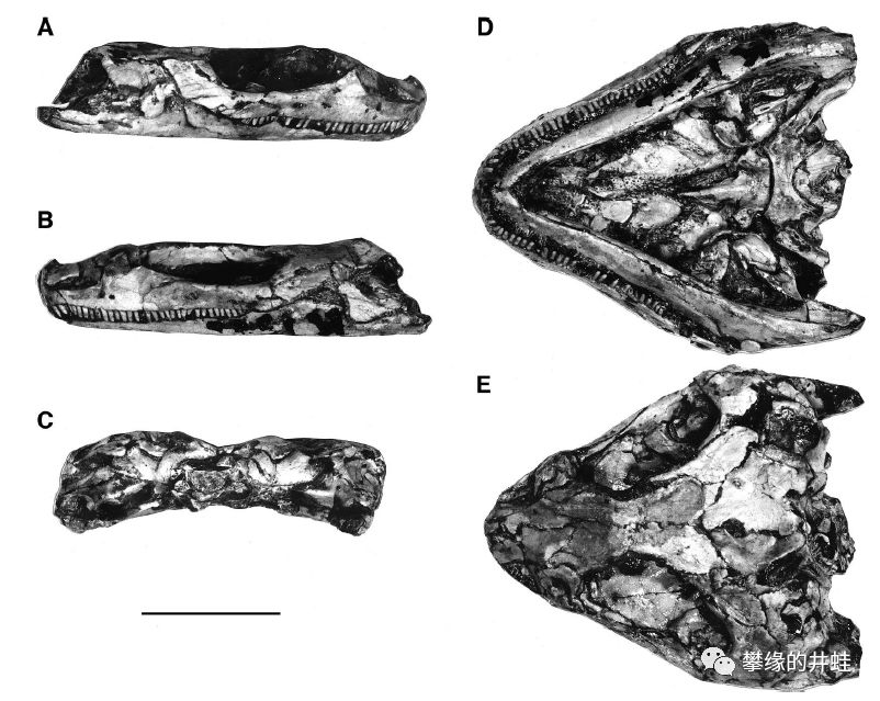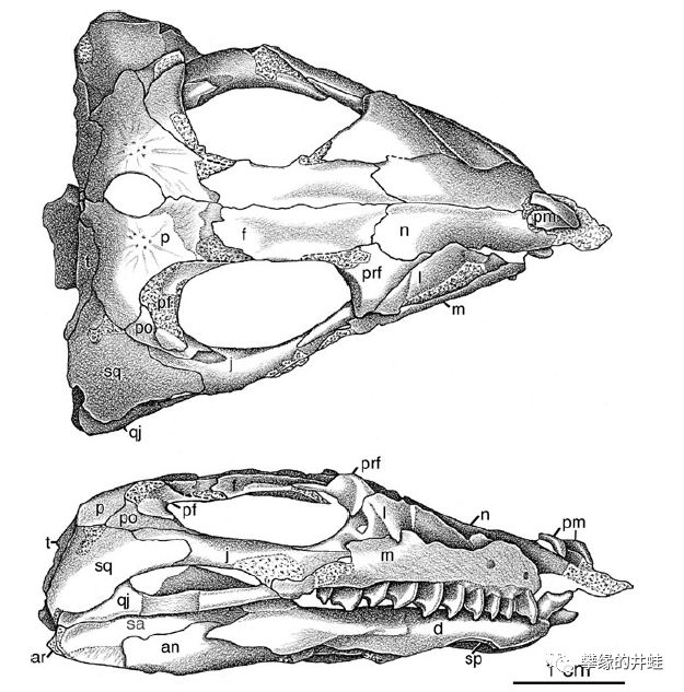 南非发现的晚二叠世欧文蜥Owenetta rubidgei头骨化石。结构很接近夜守龙,也有许多细碎的小尖牙和超级大眼洞,但颞颥孔已经消失了。图片来源自[12],标尺长度1厘米。