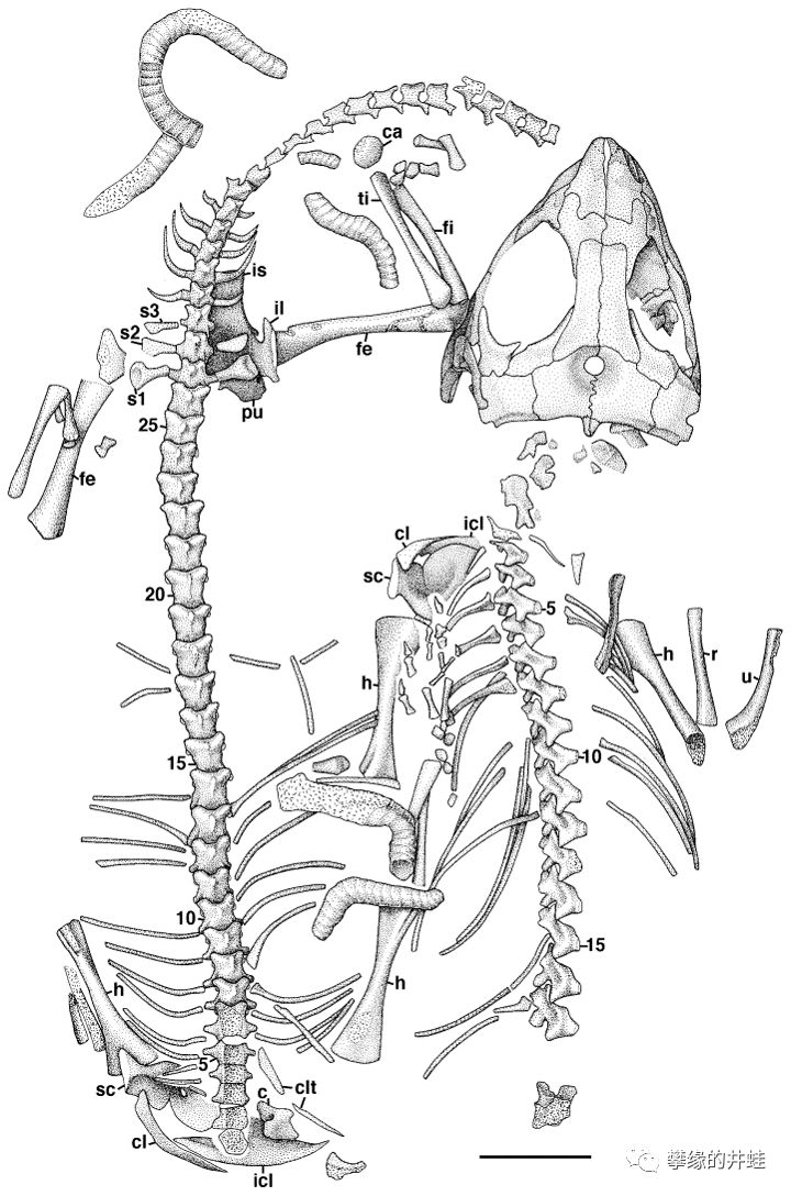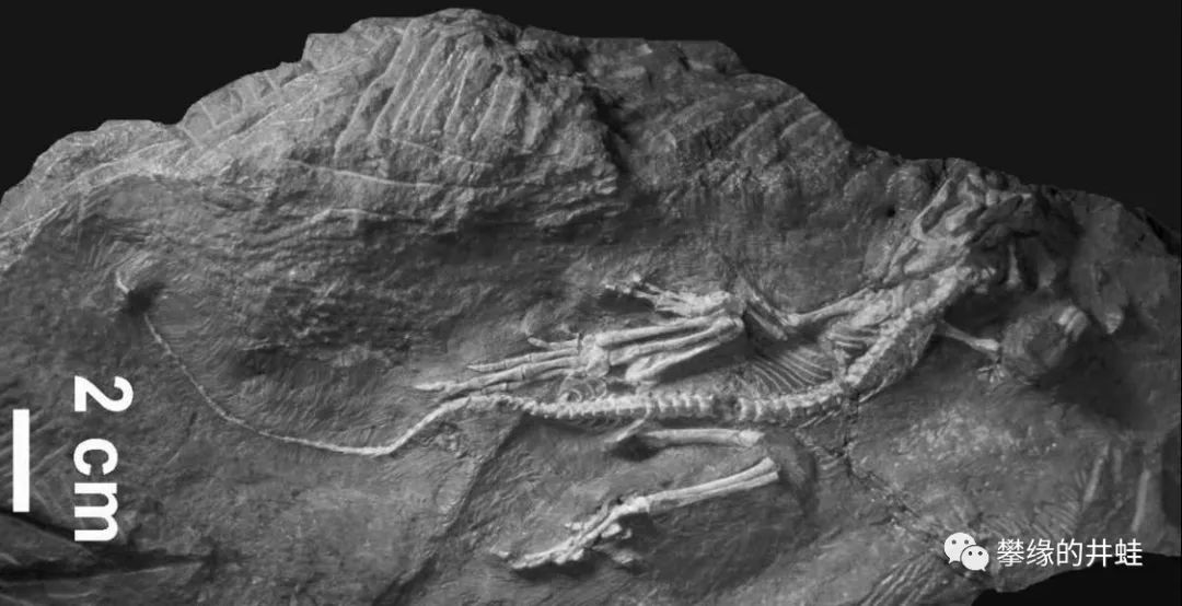 南非卡鲁盆地发现的正南龟(Eunotosaurus africanus)化石。宽扁的肋骨很容易让人联想到正在成形中的龟壳,不过也有可能只是趋同演化。关于正南龟,一种观点认为它是副爬行动物的早期分支,属于米勒古蜥总科(Millerettidea)中比较特化的一类;另一种观点认为它是龟鳖形类(Testudinata)的早期成员,应该放到真爬行动物那边去。以后写龟鳖类起源和演化的时候还会重点介绍这货。图片来源自[2]。