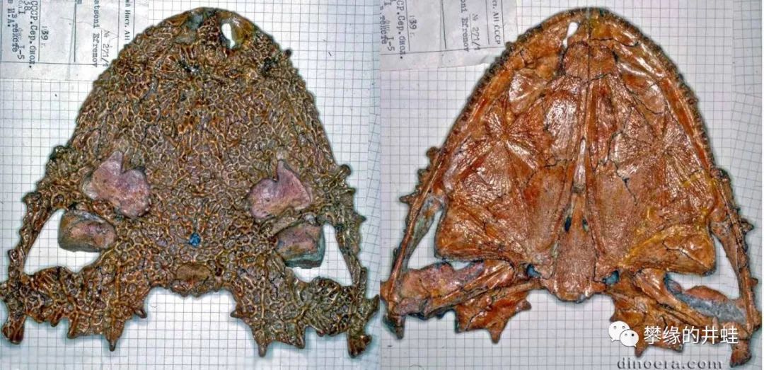 Hypsognathus fenneri模式标本化石。它的体型比前辈缩小了一点,继承了扁平浑圆的身体,头部两侧的“角”数量更多,也更加突出。图片来源见水印。