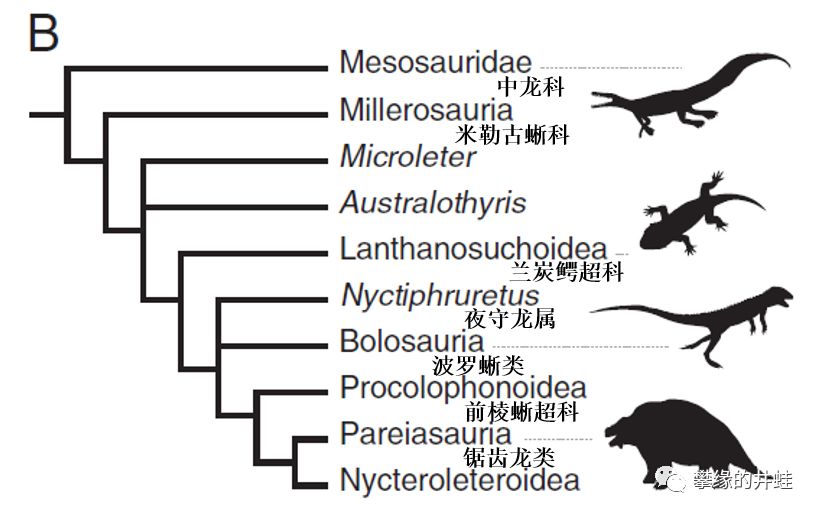 关于副爬行动物演化谱系的另一个观点。右边的剪影从上到下:纳米比亚中龙Mesosaurus tenuidens,沃氏兰炭鳄Lanthanosuchus watsoni,真双足蜥Eudibamus cursoris,盾皮龙Scutosauruskarpinskii。从这也能看出来,二叠纪的副爬行动物家族挺兴旺的,有些身影似曾相识。图片来源自[4]。