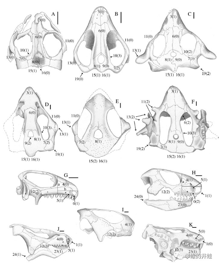 一些世界各地出土的三叠纪前棱蜥类头骨结构。A:Barasaurus besairiei(三叠纪早期,南非卡鲁盆地);B,G:Tichvinskia vjatkensis(三叠纪早期,俄罗斯);C,H:Procolophon trigoniceps(三叠纪早期,巴西南部);D,J:河套五角蜥Pentaedrusaurus ordosianus(三叠纪早期到中期,陕西府谷);E,I:亚洲新前棱蜥Neoprocolophon asiaticus(三叠纪中期,山西榆社);F,K:Hypsognathus fenneri(三叠纪晚期,新泽西州和康涅狄格州,最后的前棱蜥)。在哪个神秘空白出现之前,前棱蜥类仍然非常成功,到处都能发现它们的踪迹。图片来源自[10],标尺长度0.5厘米。