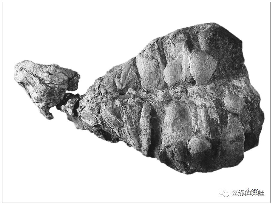 德国巴登(Baden)地区发现的三叠纪中期前棱蜥Sclerosaurus armatus化石。这个标本保存了近乎完整的脊柱和肋骨,一侧肢体,还有部分头骨。它的全长大约半米左右,身体粗壮,腹部膨大,一看就是个四足草包。图片来源自[13]。