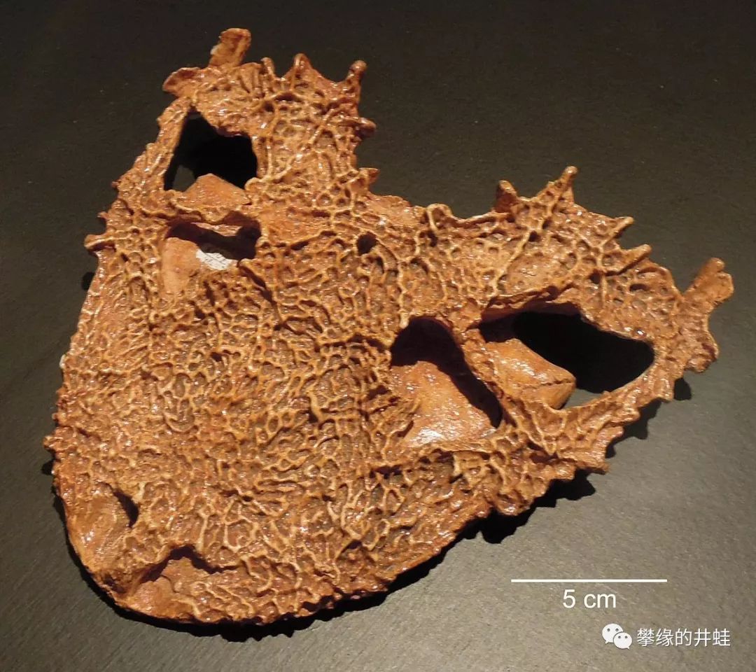 兰炭鳄属代表动物Lanthanosuchus watsoni头骨化石。这种扁额阔口的“蟾头”很像离片椎类。实际上,直到70年代(The Great Soviet Encyclopedia (1979)),兰炭鳄属还被当做古两栖动物。但眼洞后面的颞颥孔却是羊膜动物的铁证。图片来源自网络。