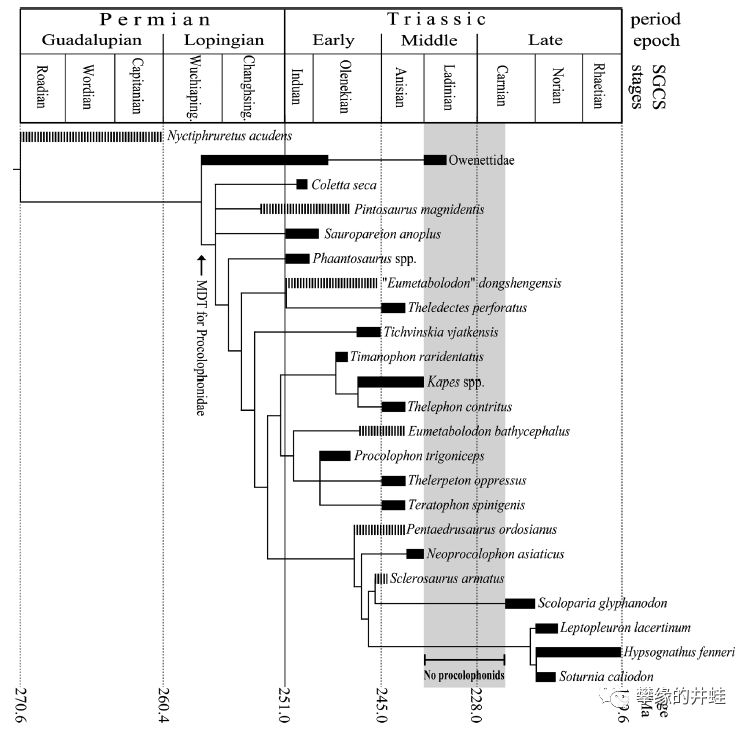 棱蜥类的演化谱系和生存年代。这张图片有几点可以关注一下:最原始的欧文蜥科(Owenettidae)在二叠纪晚期才出现。在三叠纪早期,前棱蜥类一度兴盛,涌现出许多新种类。然后在三叠纪中期出现了一段化石记录的空白(图中阴影部分)。在这段空白之后,大部分前棱蜥类销声匿迹,只有寥寥几种化石出土。最终在三叠纪末的又一场大灭绝中彻底消亡。图片来源自[10]。