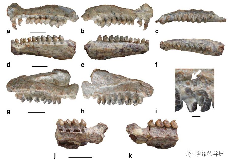 在甘肃玉门也发现了一种二叠纪中期Belebey属波罗蜥:B.vegrandis。化石为右侧上下颌骨,牙齿的特征非常明显。它是俄罗斯的B. vegrandis的近亲,表明这类动物已经扩散了到泛古大陆周边的海岛上。它们一直到二叠纪晚期,才被其他食草动物取代。图片来源自[5],标尺长度1厘米(i图为2毫米)。