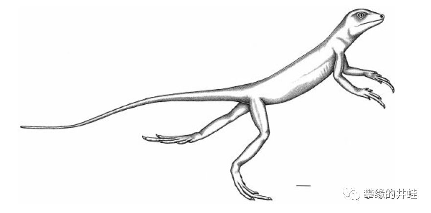 真双足蜥奔跑姿势复原图,图片来源自[7],标尺长度1厘米。作为双足奔跑的先行者,它的结构配置还是显得原始而简陋。后肢不够强健,头颈不够灵活,尾巴单薄,难以平衡体重,还有那一双外八。无常的命运并没有给真双足蜥改善这些缺陷的机会,倒是后来的几类真爬行动物接过了演化的接力棒,把双足奔跑发展到了极致。