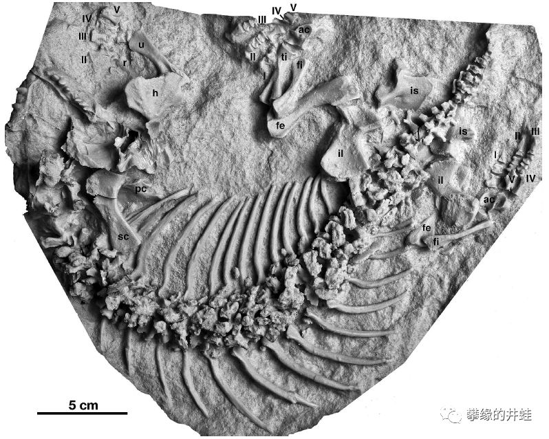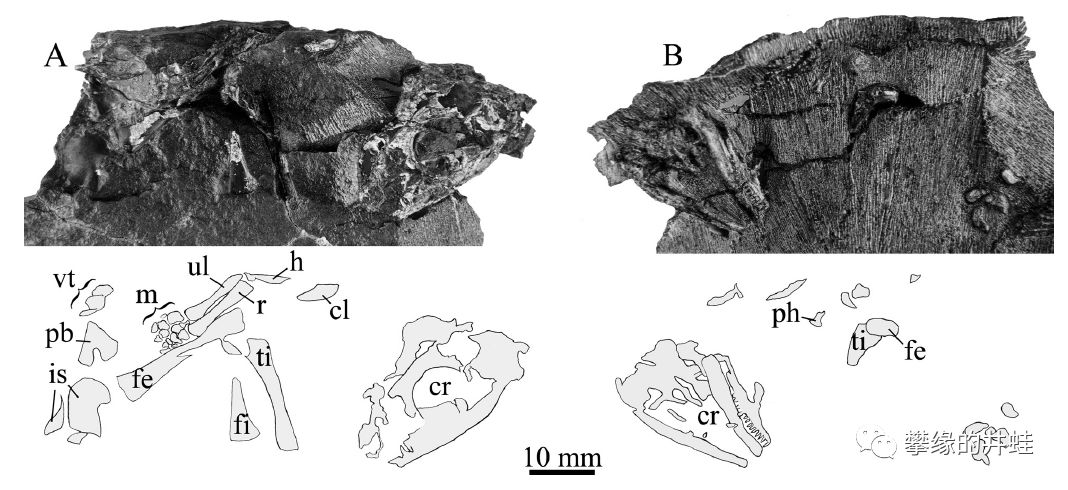 南非发现的晚二叠世米勒古蜥Broomia perplexa化石,保存了破碎的头骨,骨盆和右后肢。它和正南龟生活在同一时期,同一地区,算是久别重逢的老邻居了,但不知道二者沾亲不。图片来源自[3]。