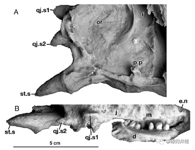 Sclerosaurus armatus头骨部分放大。在它的头部两侧,各有几根角状的长棘(qj.s1,qj.s2,st.s)。图片来源自[13]。