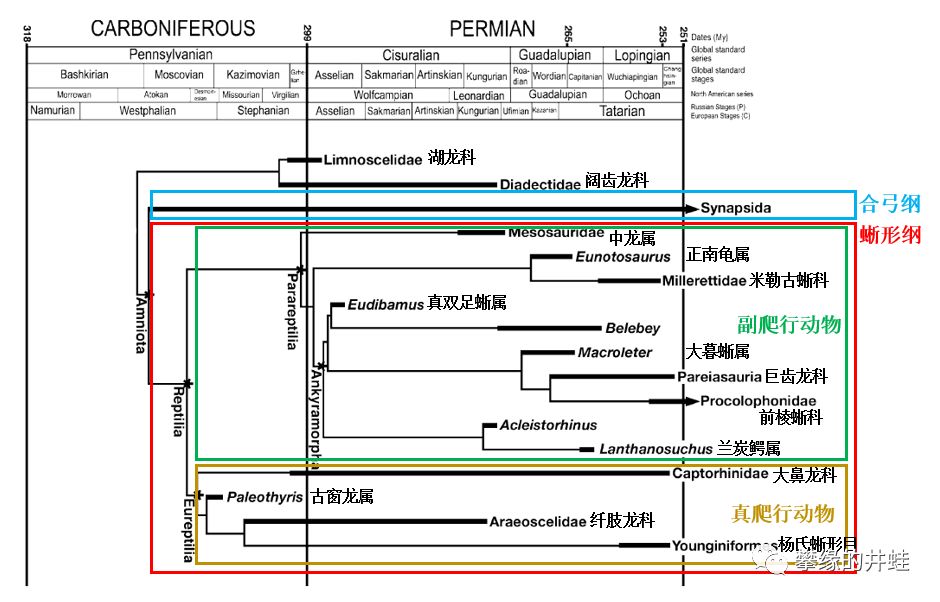 副爬行动物的主要类群和生存时代。这张图中把正南龟属(Eunotosaurus)归入副爬行动物,是比较有争议的。图片来源自[1]。