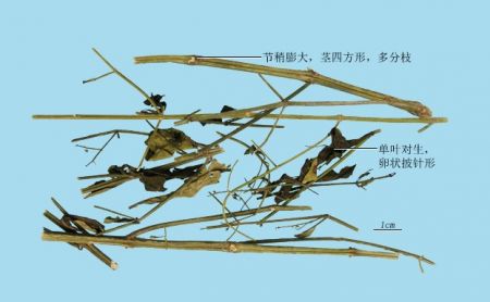 茎呈方柱形,多分枝,长50~70cm,节稍膨大;质脆,易折断。单叶对生,叶柄短或近无柄;叶片皱缩、易碎,完整者展开后呈披针形或卵状披针形,长3~12cm,宽2~5cm,先端渐尖,基部楔形下延,全缘或波状;上表面绿色,下表面灰绿色,两面光滑。气微,味极苦。