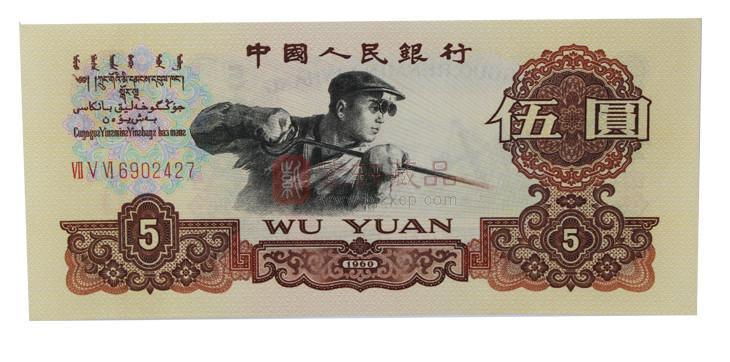 1960版五元是第三套人民币中的一员,于1969年10月20日发行,2000年7月1日停用。票面正面为炼钢工人生产图,采用凹印印刷工艺,分为三字冠七号码和二字冠八号码。
