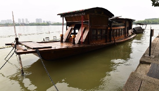 南湖岸边,红船静静地停泊。这是1959年南湖革命纪念馆按红船原样仿制的一艘画舫。