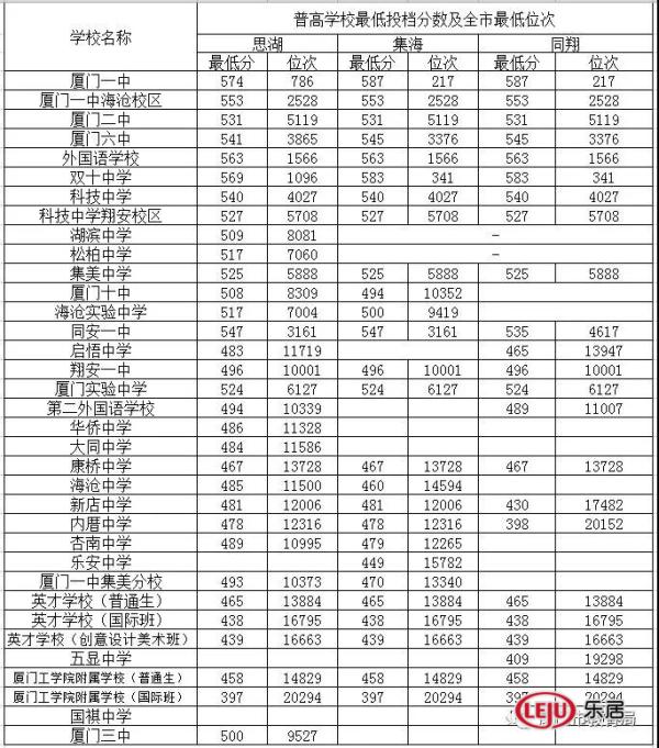 厦门一中思湖片区最低投档分574分,最低位次为全市786位;集海同翔片区最低投档分587分,最低位次为全市217位。