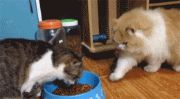我说这橘猫主子,你也不能仗胖欺猫啊。你看这体型对比,橘猫还一爪拍在对面猫主子头上,我估计这一掌可不轻,要不然对面的主子也不会立马就舍弃了眼前的美味逃跑了。