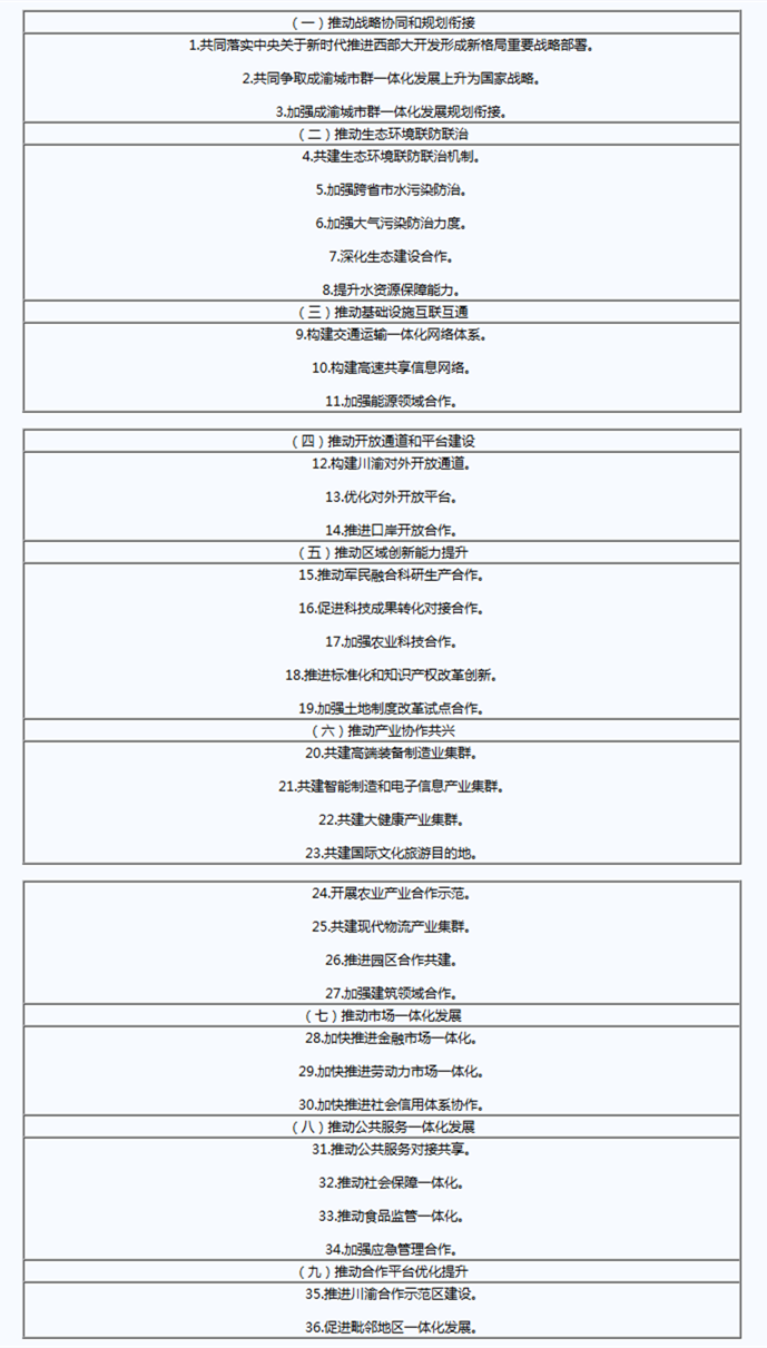 这些重点任务的涉及面非常广,包括战略协同和规划衔接、生态环境联防联治、基础设施互联互通、开放通道和平台建设、区域创新能力提升、产业协作共兴、市场一体化发展、公共服务一体化发展、合作平台优化提升等方面,是川渝两地深入贯彻落实《中共中央国务院关于新时代推进西部大开发形成新格局的指导意见》《成渝城市群发展规划》及《深化川渝合作深入推动长江经济带发展行动计划(2018—2022年)》的具体“路线图”。