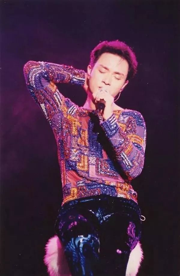 被戏称为“何宝荣(电影《春光乍泄》中张国荣饰演的角色)之歌”的《怨男》,有着“唇薄薄越来越痒那热茶亦全变凉”、“深闺梳晚妆好叫你欣赏”的填词,和被歌迷吐槽“根本不能跟唱”的复杂转调,几乎无法想象其他歌手的演绎。艳紫惨绿的灯光里,哥哥一身亮片马甲,眼角弯出笑纹,腰胯轻轻摆动,似乎是刻意为之的撩拨,又似乎只是孩子气地打着拍子。“没可能日夜问就只有呻吟”唱罢,他竟真的凑近麦克低低吐气,任由全场爆发出尖叫,再偷笑着转身。