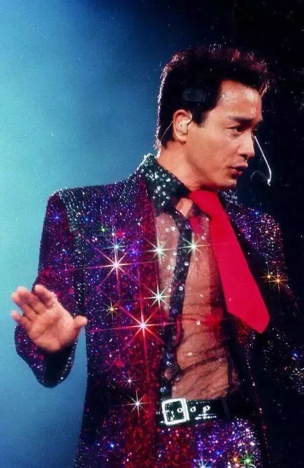 我无比感恩香港世纪末的时尚潮流,彼时八十年代的黄金之河愈流愈缓,下游的水道几乎担荷不住这浩浩荡荡的金粉金砂,便索性冲破堤坝,把金色涂了个漫山遍野。浮夸的亮片金丝和浓烈的金属色调,裹住张国荣拍《春光乍泄》时在阿根廷生病腹泻而略显瘦弱的躯壳。减下去的那些斤两,刚好足够他水落石出般显出几分骨骼线条,撑起这些夸张的演出服,又足够他挤进梦幻与现实的窄门,追光汇聚之时,便闪耀出摄人心魄的美之霓虹。