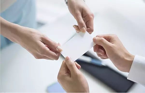 给客户递名片时,文字向着对方,双手拿住上面两脚拇拇指在上,四指弯曲在下一边递交一边清楚说出自己的姓名,同时鞠躬15度。接受对方的名片时用双手去接,拿到后要马上看正确记住对方的姓名,如果遇到对方姓名有男人的文字,应马上询问。