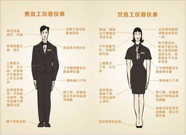 论是男女头发必须干净,修理整洁,不留长指甲,女士可以化淡妆,但是不要佩戴耳环项链等装饰品。男士必须是刮净胡须,不要留长发,当然了也不允许戴耳环一些首饰什么之类的。