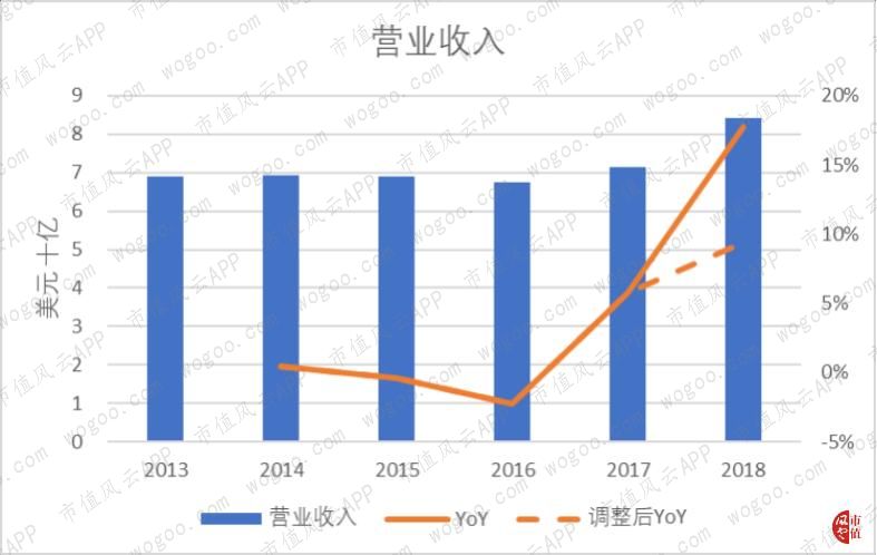 公司的产品销售收入在2013-18年的CAGR仅为2.3%。