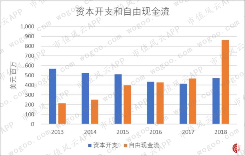 2013年以来公司的自由现金流不断增加,其中2018年达到8.63亿美元,同年资本开支为4.7亿美元。公司的现金流状况良好。
