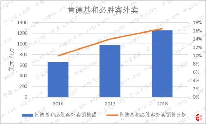 2018年约14%的肯德基销售额和23%的必胜客销售额是通过外卖销售的。