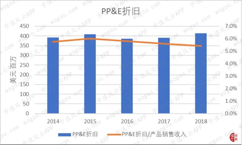 近5年,PP&E折旧占公司产品销售收入的比例在5%到6%之间,其中2018年为5.4%。