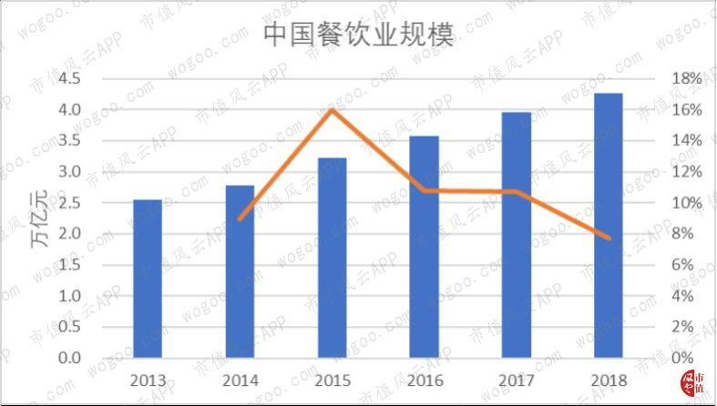 同时期,中国餐饮业的规模由2013年的2.56万亿元增长到2018年的4.27万亿元,CAGR达到10.8%。