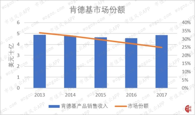 其结果自然是,肯德基产品销售收入(注:不包括授权费和其它收入)占限额以上快餐服务业营业额的比例不断下降,其中2017年为25%。