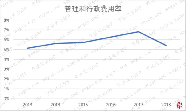 管理和行政费用率在2018年为5.4%,与前几年相比变化不大。