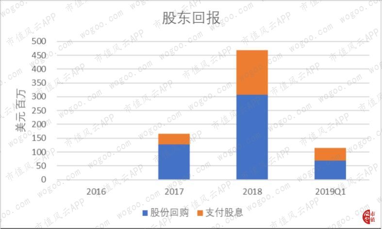 2016年上市后,公司累计回购股票5.03亿美元,累计分红2.45亿美元。其中,2018年股票回购和分红分别为3.07亿和1.61亿美元,合计占当年自由现金流的比例为54%。