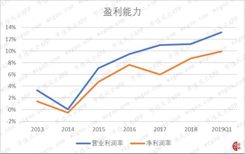 2018年,公司的营业利润率和净利润率分别达到11%和10%。由于会计准则的变化,2018年的毛利率无法与之前的数据比较,风云君在这里只展示营业利润率和净利率。