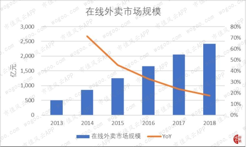 近年餐饮行业增长的一大动力是外卖。2013-18年,中国在线外卖市场规模的CAGR达到36.9%,其中近两年增速为23.5%、17.6%。